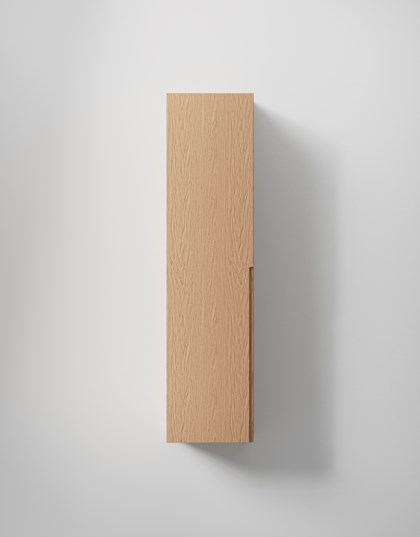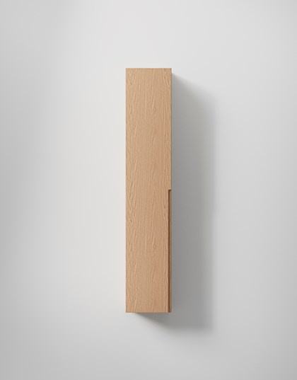 Ett grundare men rymligt högskåp med integrerad grepplist längs halva dörrens långsida. Ger tydligt grepp och genomtänkt förvaring.
