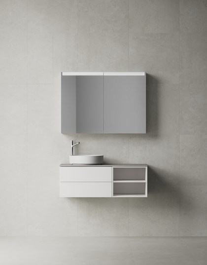 Välj till tvättstället Smooth i solid surface för en sammetslen, porfri yta eller ett av våra klassiska porslinsalternativ: Sharp, Soft eller Shape. Vill du hellre arbeta med bänkskiva finns alternativ i både mineralkomposit och solid surface med ultramatt finish i Soft White. I kombination med ovanpåliggande Soak eller underlimmade Wave skapar du enkelt en badrumsmöbel med både flexibilitet och personlighet. Bänkskivan kan fås med (standard) eller utan hål för blandare, något du enkelt konfigurerar i Studio. Komplettera med smarta tillval som sensorstyrd belysning i och under kommoden, eluttag i nedersta lådan och Plus Divider som håller ordning. Du väljer själv öppningsalternativ, från klassiska grepp till push. Oavsett val får du fullt utdragbara lådor med soft-close och antiglidmattor som ger en skönare badrumsvardag.