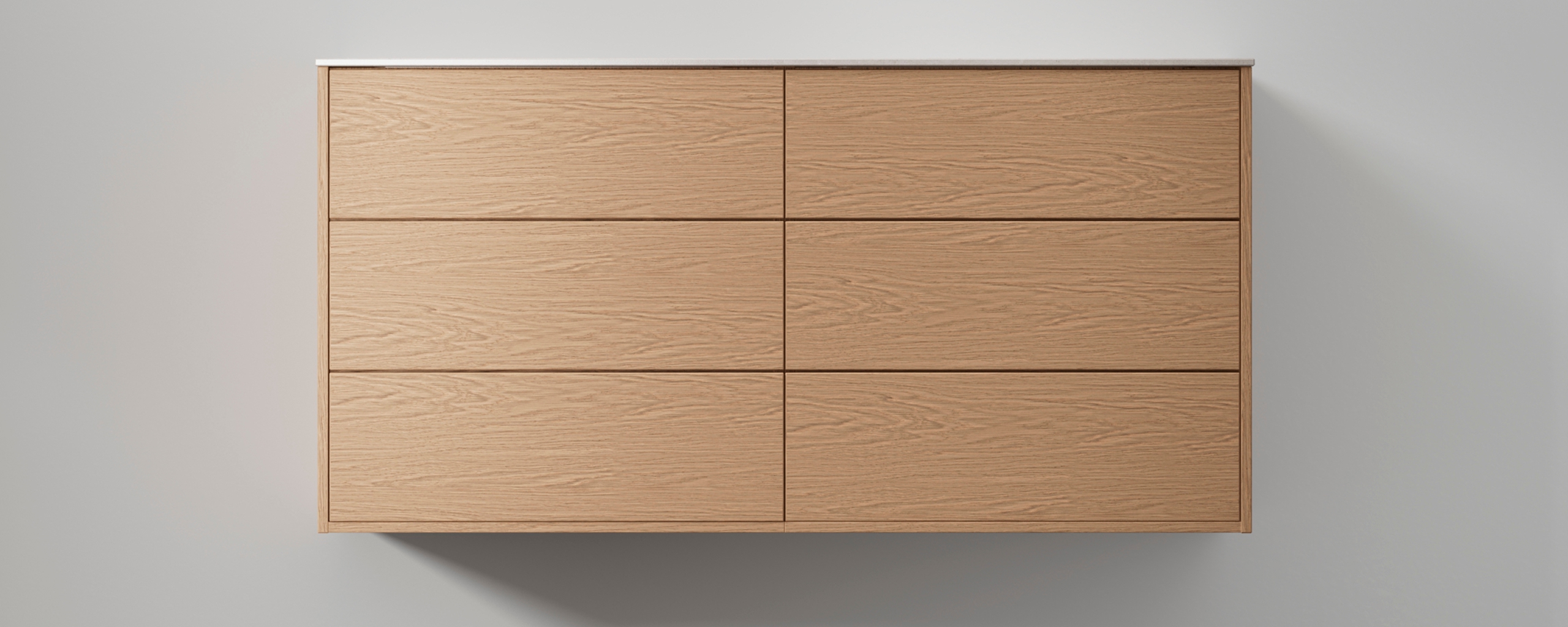 Välj till tvättstället Smooth i solid surface för en mjuk, porfri yta eller satsa på ett av våra klassiska porslinsalternativ som Sharp, Soft eller Shape, alla med egen karaktär. Vill du kombinera med bänkskiva finns flera alternativ i mineralkomposit med matt finish eller solid surface med ultramatt, porfri yta. Tillsammans med det ovanpåliggande tvättstället Soak eller det underlimmade Wave skapar du enkelt ett uttryck som passar just dig. Bänkskivan kan fås med (standard) eller utan hål för blandare – något som enkelt konfigureras i Studio. Komplettera med sensorstyrd belysning i och under kommoden, eluttag i nedersta lådan samt förvaringsinsatsen Plus Divider. Välj mellan flera öppningsalternativ, inklusive push. Alla lådor är fullt utdragbara och utrustade med soft-close och antiglidmattor som gör vardagen enklare.