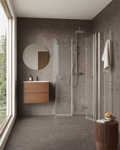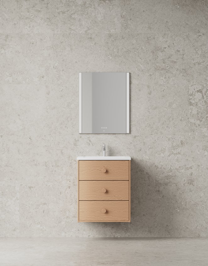 Med sin släta front och höga stomme på 70 cm erbjuder Terra Solid 60 mer av allt, mer förvaring, mer materialkänsla och mer uttryck. Det här är en solitär som tar plats och blir badrummets naturliga mittpunkt. Kommoden finns i ett fanér med större mönster än övriga serier, ett ekfanér som förhöjer känslan av hantverk och ger möbeln dess unika karaktär. För ett mer avskalat uttryck finns Terra Solid även i Pure White eller i valfri NCS-kulör, för dig som vill sätta en personlig prägel på ditt badrum. Trots sin kompakta bredd rymmer möbeln tre lådor. Formspråket är stilrent och kompromisslöst, byggt på skandinaviskt hantverk med genomtänkta detaljer på alla plan. Samtliga ytor är behandlade med TX Top Extreme™ för att stå emot fukt och slitage i minst 15 år.