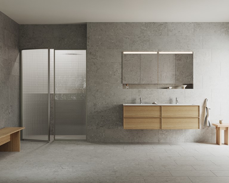 Kommod med dubbla tvättställ och dolt grepp i modern front.