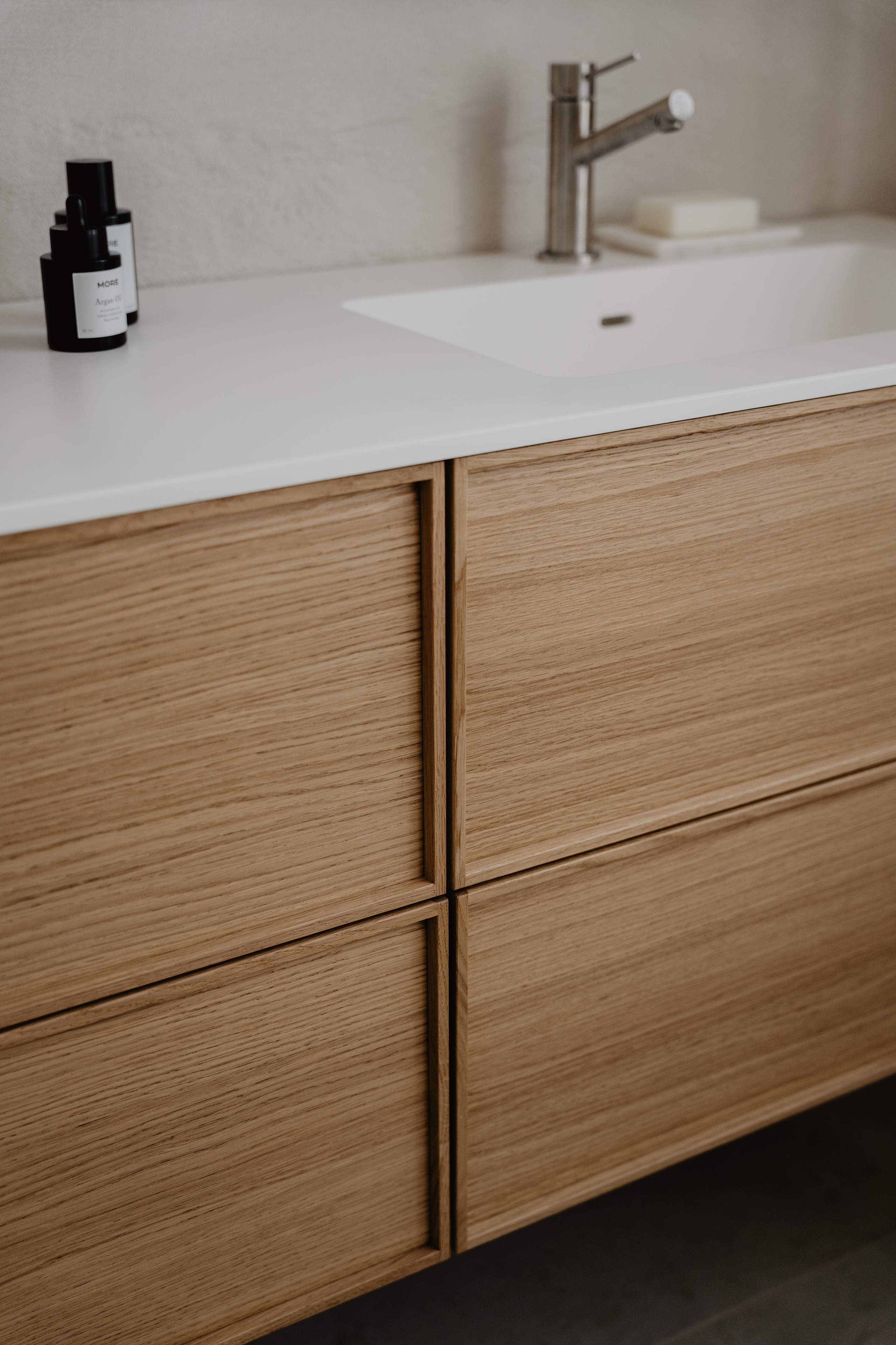 Mineralkomposit känns varm vid beröring och ger en inbjudande känsla – ett mer välkomnande materialval än många andra, och särskilt lämpat för badrum där helhetskänslan är viktig. Vanligt förekommande drag i mineralkomposit är bland annat olika pigmentbildningar, små porer, hårfina poleringsrepor samt små färgprickar i de enfärgade materialen. Detta påverkar inte kvaliteteten på produkten.